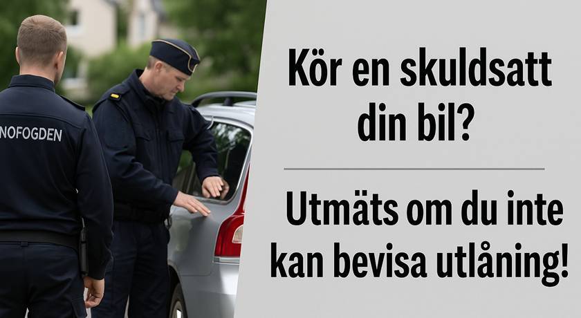 Allt fler svenskar (privatpersoner som företag) blir av med sina bilar efter att ha lånat ut dem till en släkting, vän, kollega eller anställd. Det räcker att fordonet används i bara några timmar av en person med skulder och att du inte kan bevisa att bilen faktiskt bara är utlånad. Då har Kronofogden laglig rätt att utmätta bilen på plats, även om den är registrerad i ditt namn.